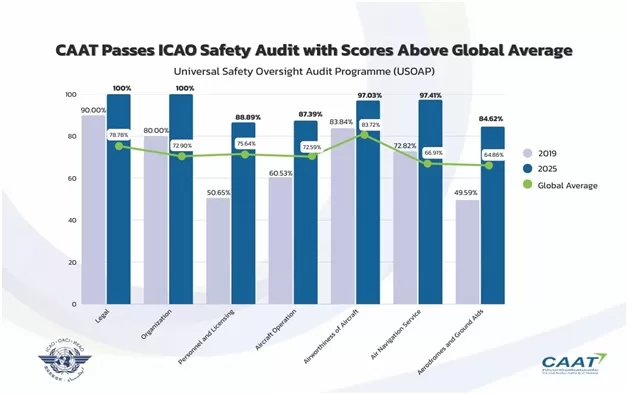 The preliminary results, covering only the areas under CAATs direct responsibility -namely legislation, civil aviation organization, aircraft operations, airworthiness, personnel licensing, air navigation services, and aerodromes – showed a preliminary score as high as 91.35%, nearly 20% above the global average of 70.50%. ICAO will be sending a draft report to be reviewed within 90 days after the audit is completed, and the official scores are expected to be announced on ICAOs website around February 2026.