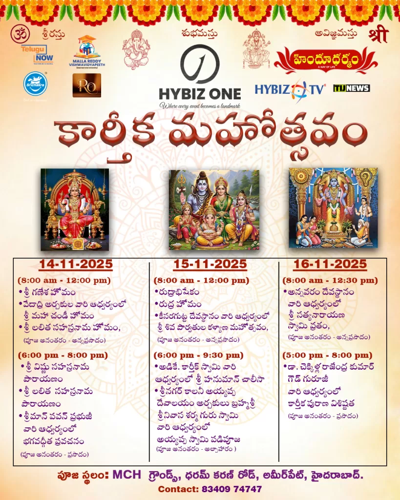 The city of Hyderabad is set to witness one of the most divine and vibrant celebrations of the year — Hybiz One Karthika Mahotsavam 2025, a three-day spiritual festival filled with faith, light, and divine grace. Organized by Hybiz One, this grand event will take place from November 14th, 15th, 16th, 2025, at MCH Stadium, Ameerpet, Hyderabad.