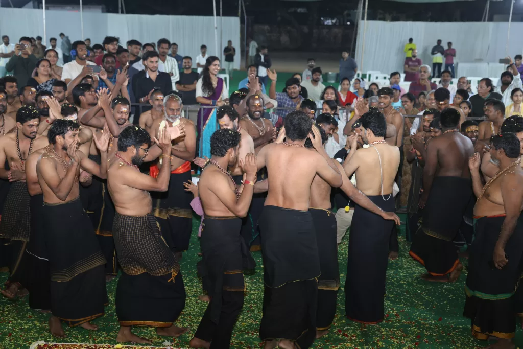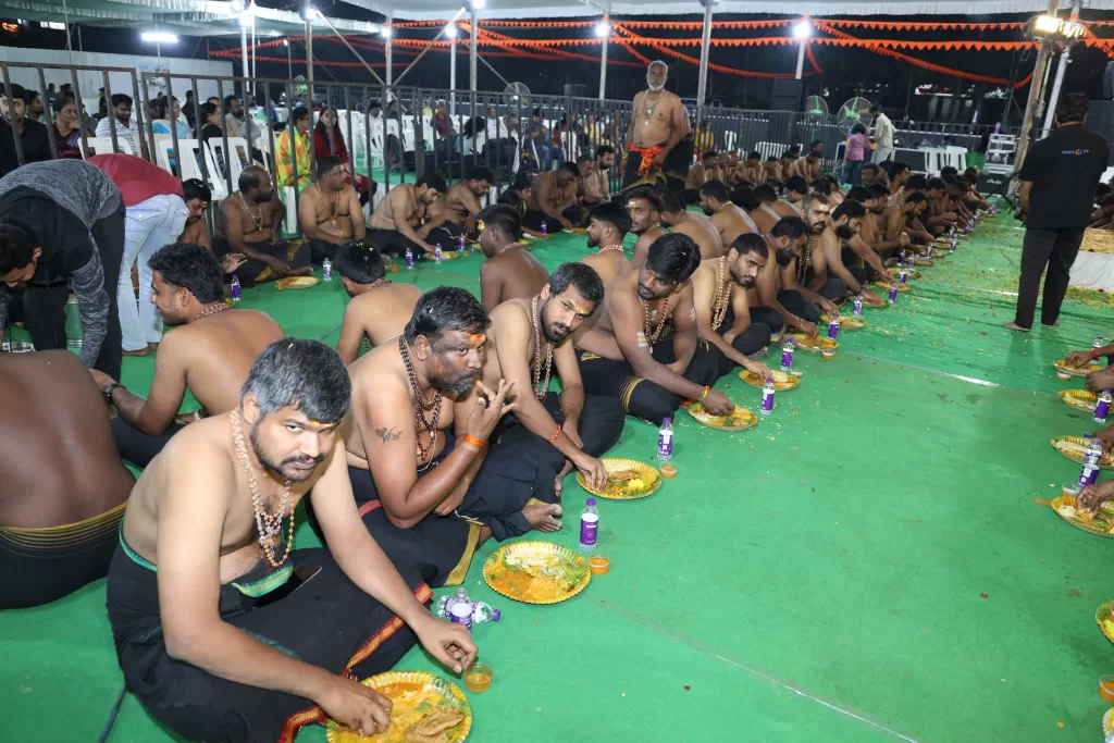 In the evening, Hanuman Chalisa Parayanam was conducted under the leadership of Adike Karthik Swami, followed by the grand Ayyappa Padi Pooja, led by Brahmashri Srinivasa Sharma Guruswamy.