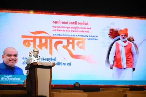 Hon’ble Union Home Minister, Ministry of Home Affairs and Cooperation, India, Shri Amit Shah, addresses the attendees of Namotsav 2025, India’s first musical multimedia show presenting the life of Prime Minister Shri Narendra Modi, at Sanskar Dham, in the presence of Shri Bhupendrabhai Patel, Hon’ble Chief Minister of Gujarat and Shri Harshbhai Sanghavi, Deputy Chief Minister of Gujarat, alongside several distinguished dignitaries. Namotsav celebrates Prime Minister Narendra Modi’s journey of struggle and leadership. In just 11 years, his vision of Viksit Bharat 2047 has inspired 140 crore Indians to aspire for global leadership across every sector. From children and youth to farmers and industrialists, the Prime Minister has empowered every section of society through transformative schemes that are improving lives nationwide, said Union Home Minister Shri Amit Shah.