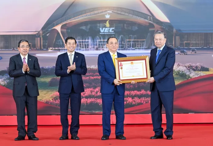 Vietnam’s Party General Secretary To Lam presents the First-Class Labor Order to Mr. Pham Nhat Vuong- Chairman of Vingroup – in recognition of the Group’s outstanding achievements, at the National Exhibition Fair Center in Hanoi, Vietnam